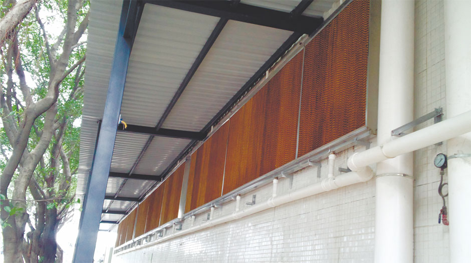 水簾降溫工程由負(fù)壓風(fēng)機(jī)和水簾墻兩大部分構(gòu)成,降溫區(qū)域一面安裝負(fù)壓風(fēng)機(jī),另外一面安裝水簾循環(huán)系統(tǒng)。循環(huán)水泵不間斷地把水箱內(nèi)的水提升,并通過(guò)布水系統(tǒng)均勻地噴淋在蒸發(fā)過(guò)濾層上,(濕簾即多層波紋纖維疊合物),保持濕簾一直濕潤(rùn)。當(dāng)對(duì)面負(fù)壓風(fēng)機(jī)開(kāi)啟時(shí)使室內(nèi)產(chǎn)生負(fù)壓,迫使空氣從水簾一面進(jìn)入,在經(jīng)過(guò)水簾的時(shí)候由于水蒸發(fā)吸熱,空氣的溫度下降,從而使進(jìn)入到室內(nèi)空氣溫度下降,整個(gè)區(qū)域內(nèi)達(dá)到降溫的效果。